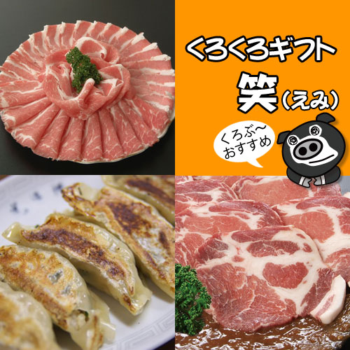 売れ筋トップの黒豚のしゃぶしゃぶ(ロース&バラ)各200g、惣菜人気No1のロース味噌漬に黒豚の餃子2パックが全部入ったセットにしました。- くろくろセット笑(えみ) ロース、バラしゃぶしゃぶ(200gづつ)、餃子2パック、ロース味噌漬1枚